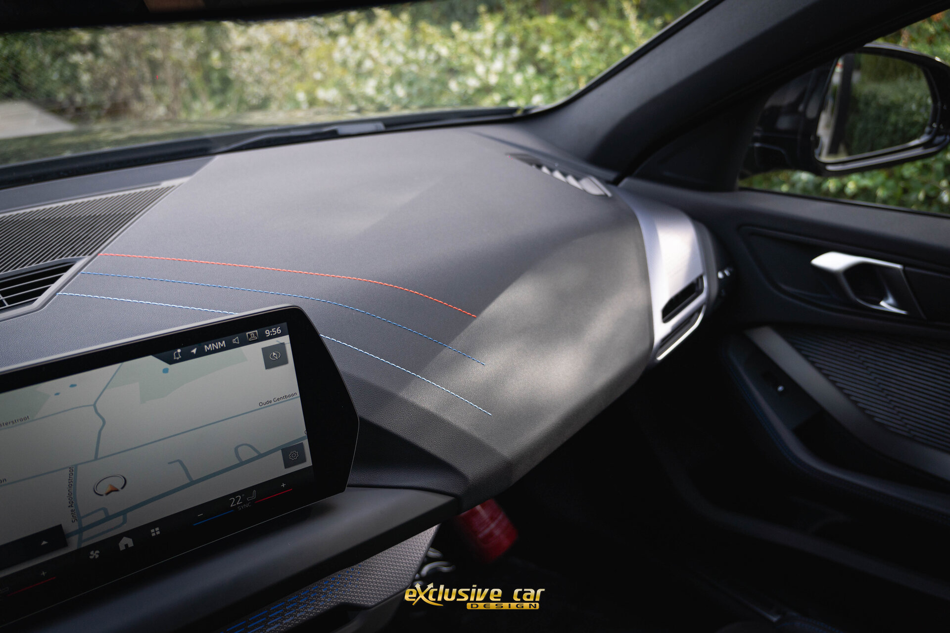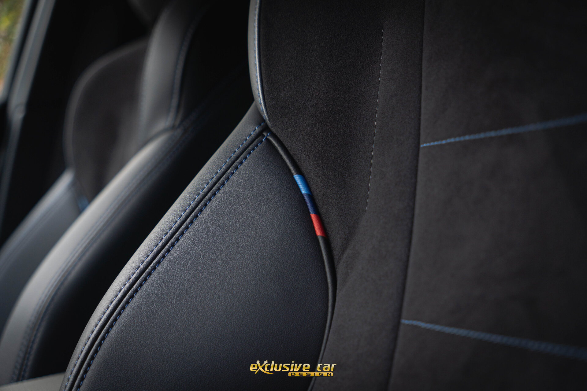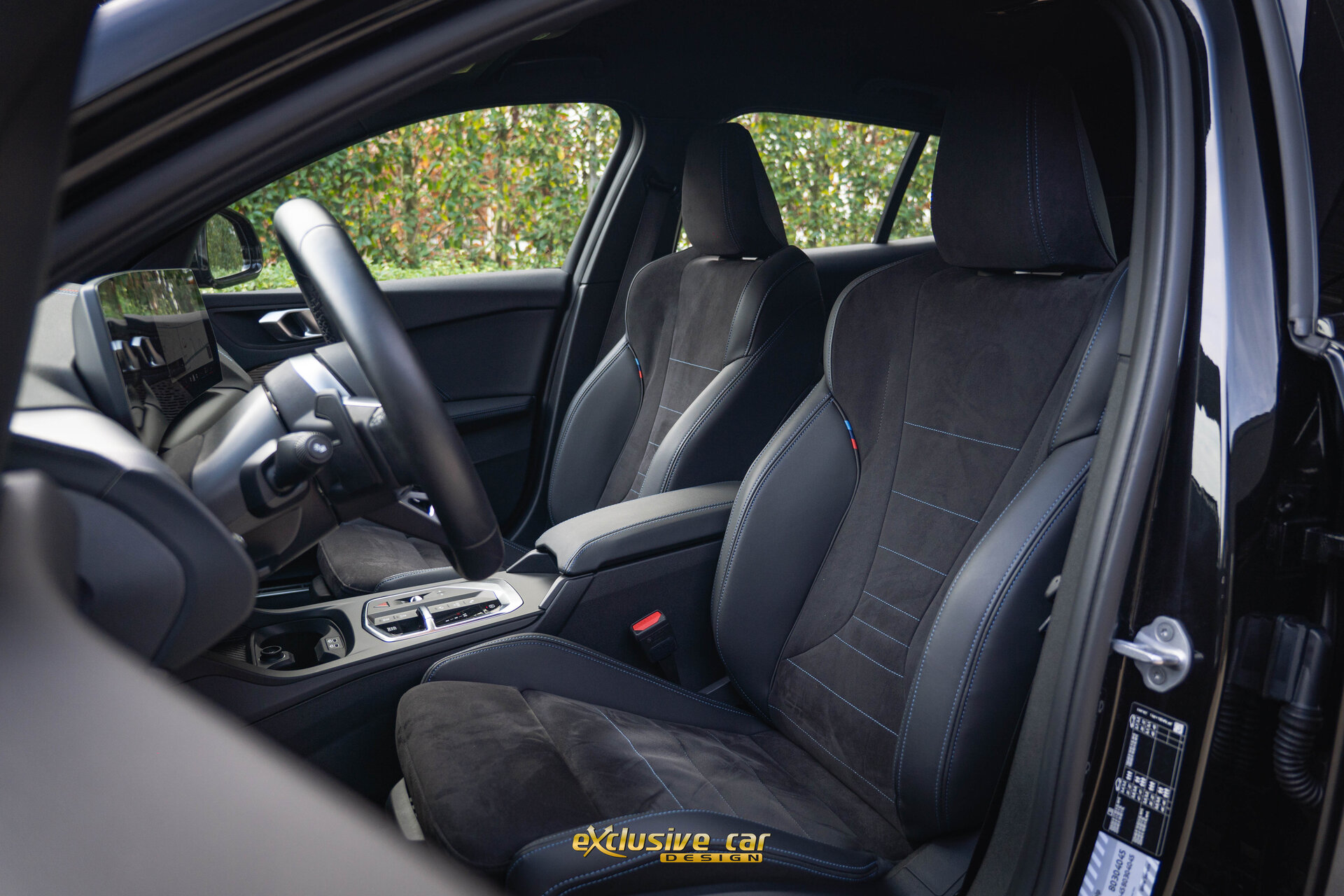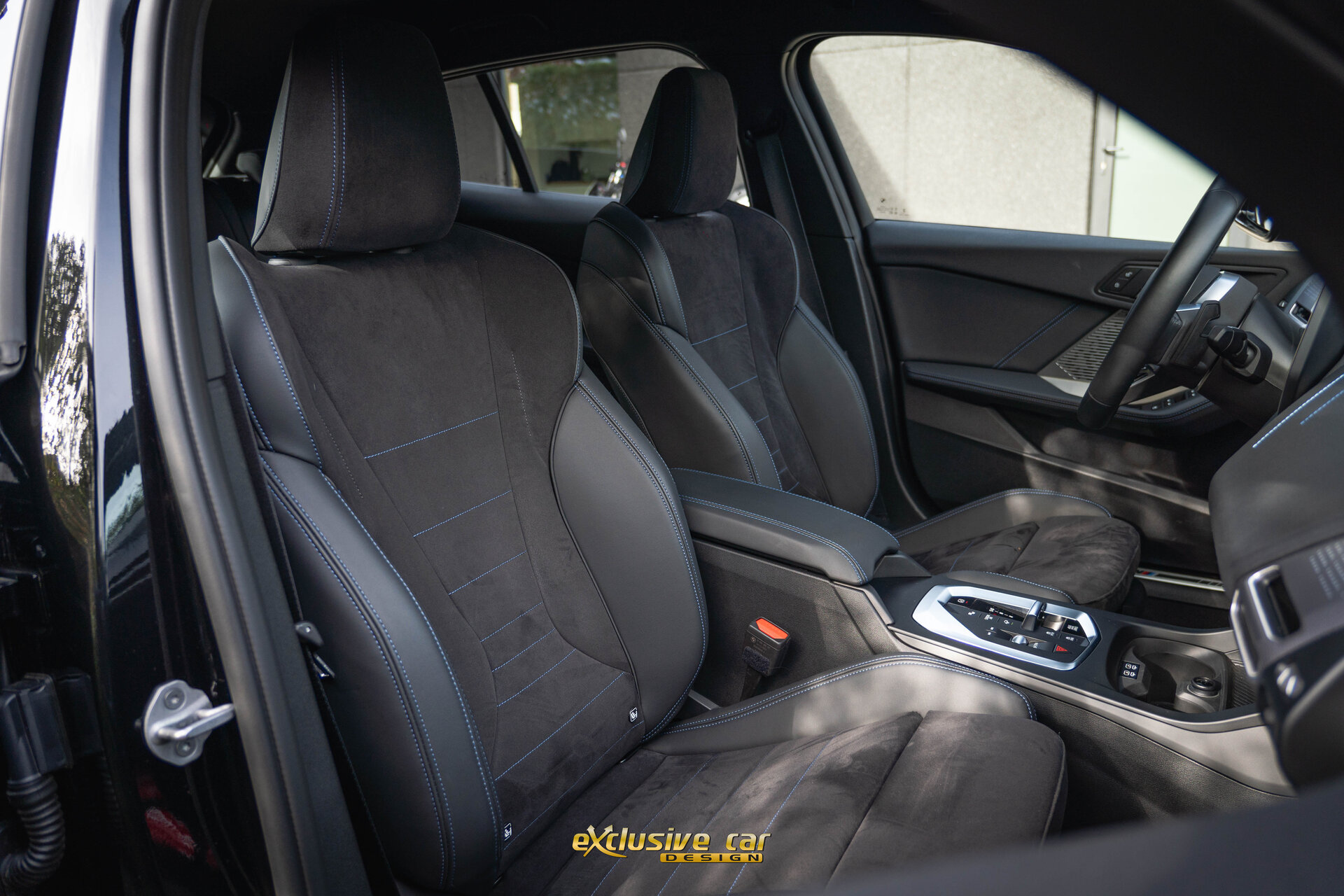 - M Sportinterieur in Veganzaleder en Alcantara, met blauwe contraststiknaad
